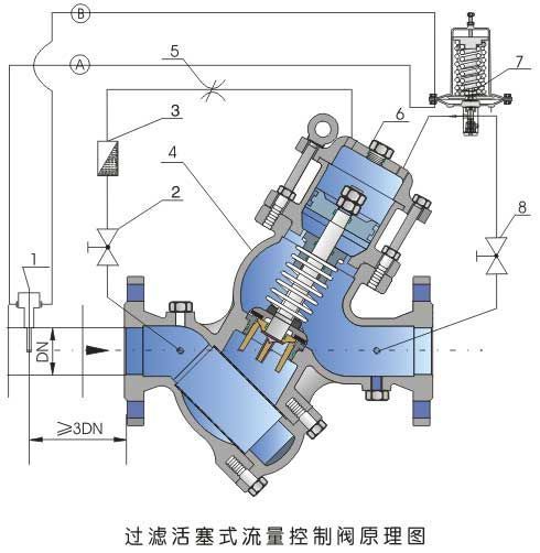 三、YQ98002型过滤活塞式安全泄压阀--特点: 1.毕托管向极敏感的限流导阀传递压信号, 无孔板孔口节流, 无压力损失, 节能. 2.限流导阀中有极灵敏的弹簧对流量进行调节, 操作简单而且准确. 3.Y形宽体阀腔,流阻小.抗汽蚀性强. 日介质自身压力自控, 无需外供驱动源. 5.主阀体的进口法兰与阀座之间设了过滤器, 节省投资成本和安装费用. 6.内外表面均喷浍环保涂层.确保产品的防府蚀及安全。 四、YQ98002型过滤活塞式安全泄压阀--技术参数:
