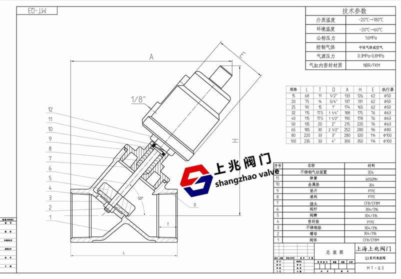 ![]() 不锈钢内螺纹气动角座阀--工作原理: 在非工作状态时,由于弹簧力作用,阀门常闭(开)。当执行器活塞被压缩气体作用时,阀门打开(关闭)。双作用形式靠压缩气体控制阀门开关。 不锈钢内螺纹气动角座阀--应用范围: 啤酒饮料灌装设备 制药及医疗设备 印染纺织 化工行业 气体工业 高温灭菌 发泡机械 水/污水处理 不锈钢内螺纹气动角座阀--特点: 流量大,流阻小,无水锤 Y型设计,增加30%流量 超长使用寿命 阀杆自动校正,自润滑,免维护 气缸采用不锈钢材质,在恶劣环境中更加优秀,可360°旋转。 不锈钢内螺纹气动角座阀--技术参数: 管道压力:Max1.6Mpa(232psi) 控制压力:0.3-0.8Mpa(43.5-116psi) 控制介质:中性气体或空气 阀体材料:CF8M/CF8(SS316,SS304) 密封材料:聚四氟乙烯 气缸材料:CF8(SS304) 气缸尺寸:27mm,32mm,40mm,50mm,63mm, 80mm,100mm,125mm 适用介质:水,酒精,油,染料,蒸汽,中性气体或液体,有机溶剂,酸碱溶液 介质温度:-10℃-+180℃,25℃-+220℃ 环境温度:-10℃-+80℃ 控制形式:单作用常闭,???,双作用常闭,双作用自由态 连接形式:螺纹式,焊接式,法兰式,快装式 不锈钢内螺纹气动角座阀图纸: ![]() |