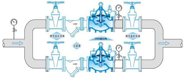 安装减压阀的要点。 (1) 减压阀的安装应在供水管网压力试验和漂洗完成后进行。应检查管道压力测试和冲洗记录。 (2)安装前应检查泄压阀。其规格和类型应符合设计??刂乒苈吠獾挤в氲挤У牧硬课徊挥λ啥?,外观应无机械损伤。阀门中的异物应该被清除。 (3)为便于操作和维护,泄压阀一般直立安装在水平管道上。比例溢流阀应垂直安装。水平安装时,单呼吸安全阀的孔应向下。双呼吸孔安全阀的孔口应该是水平的;可调式溢流阀应水平安装。封面应该向上。 (4)安全阀必须严格按照阀体上的箭头方向安装,以保持与流体流动方向相同的方向。如果水质不干净并含有杂质,则必须将过滤器安装在减压阀的上游入口处(我们建议过滤精度不应小于0.5mm)。 (5) 过滤器应安装在进口侧,控制阀应安装在其前后。 (6)为防止阀门过压,应在离阀门出口不少于4M的位置安装减压阀。如果需要在热水系统中安装泄压阀,则必须在泄压阀和膨胀箱之间安装止回阀。这样不仅可以使膨胀罐吸收由于热膨胀而增加的水量,还可以防止热水返回或压力波动对减压阀的影响,并确保压力释放的长期正常运行 阀。 减压阀在管道中起到一定的止回功能。 为了防止水锤损坏,也可以安装一个小的膨胀水箱,以防止损坏管道和 阀门。 过滤器必须安装在减压阀的入口管前方并展开。 水箱必须安装在泄压阀出口管的后面。 (7)安装不带压力表的自减压阀时,请在前后相邻的零件上安装压力表。 |