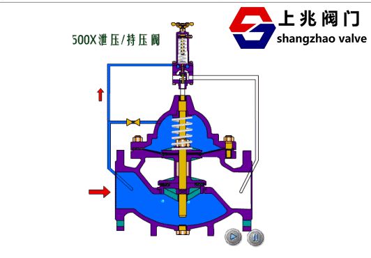 首先,500X-16P-200持压/ 泄压阀 - 概述 500X-16P-200持压/泄压阀由主阀,压力释放/压力保持导向针阀,球阀,微过滤器和压力表组成,形成液压控制接管系统。它可以通过液压自动操作用作减压阀或压力保持阀。当用作减压阀时,供水管路压力可以保持在设定的安全值以下;对于压力保持阀,主阀的上游水压可以保持在设定值以上,以维持主阀的上游供应压力。 1.作为 减压阀:当减压/保压先导阀调节到泄压状态时,水流过针阀,主阀控制室,球阀A,减压/压力保持先导阀,球阀B到出口。主阀打开。当入口压力超过泄压/压力保持先导阀设定的安全值时,减压先导阀将自动打开,部分水通过球阀C排出,以释放管道的压力。当压力恢复到安全值时,减压阀会自动关闭。制作减压阀时,每个球阀都是常开的。 2.作为保压阀:当压力释放/压力保持先导阀调节到保压状态时,只要主阀入口水压低于先导阀设定值,先导阀就会关闭。主控制室升压,主阀关闭。当主阀在上游供应时当压力超过先导阀的设定压力时,可以打开压力保持阀,控制室内的水通过球阀排出到出口,控制室的主阀打开, 开始供水,即保持上游水压。 当用作压力保持阀时,球阀C通常关闭或用线塞代替。 三,500X-16P-200 持压泄压阀 - 主要技术参数: