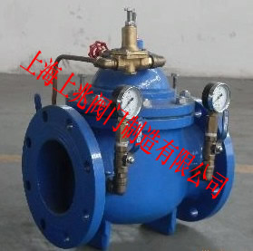 200X-16-100减压稳压阀由主阀,先导阀,针阀,球阀,微过滤器和压力表组成,形成液压控制接管系统。使用时,当设定出口压力时,可以自动保持稳定的出口压力。本产品采用自支撑先导阀,不需要其他设备和能源,维护方便,压力控制精度高,受入口压力和流量影响小,减压和电压调节可靠。广泛用于高层建筑,生活区等供水管网系统和城市供水工程。 当阀门从入口端供水时,水流过针阀进入主阀控制室,出口压力通过导管流向导阀。当出口压力高于先导弹簧设定值时,先导阀关闭??刂剖彝V古潘?,此时主阀控制腔室压力上升并关闭主阀,出口压力不再上升。 当阀门出口压力下降到先导阀设定压力时,先导阀打开,控制室向下游排放。由于先导阀系统的位移大于针阀的进水口,因此主阀控制室中的压力下降。入口压力打开主阀。在稳定状态下,控制室有相同的排水和排水,主阀开度不变,出口压力稳定。可以通过调节先导弹簧来设定出口压力。 三,200X-16-100 减压稳压阀 - 主要技术参数: