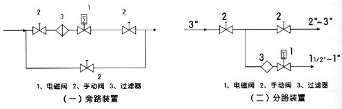 1、安装时电磁阀线圈向上,并保持垂直位置,电磁阀上箭头或标记应与管道流向一致,不得安装在有溅水或漏水的地方。 2、电磁阀的工作介质应清洁无颗粒杂质,电磁阀内件表面上的污物及过滤器,需定期清洁干净。 3、在电磁阀发生故障时,为了及时隔离电磁阀,并保证系统正常运行,最好安装旁路装置(如图一)。 4、在管路系统中,安装在支路上的电磁阀通径应小于主管道阀门的通径(如图二)。 5、安装在电磁阀前,管道必须清洗干净。建议在阀前安装过滤器,蒸汽管道安装疏水阀。 6、不能将阀安装在管道的低凹处,以免因蒸汽冷凝水、杂质等沉淀在阀内而妨碍动作。 7、普通型不能在爆炸危险场合使用。 8、在管路刚性不足情况下,建议把阀前管道用支架固定,以免电磁阀工作时引起振动。 9、在安装前,要注意要看清产品标牌,认真阅读使用说明书,判断产品是否符合使用条件。 10、电磁阀前后管道上需安装压力表,以便观察管道压力。