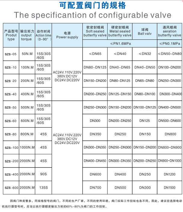 产品介绍 SZS精小型电动执行器产品介绍: 快开电动执行器适用于快开需求的球阀,蝶阀等电动快速 - 开关阀,快开电动球阀,快开蝶阀等。 0-90°全行程:全开,全程单向动作时间2秒(快速切换)。 适用于压力高,压差大,不能使用电磁阀的高开启场合。 适配阀门:球阀、V型调节阀、蝶阀、通风阀门、风门、风机、动态平衡阀、旋塞阀等部分旋转阀和其他工业领域的机械定位旋转。 快开电动执行器在1500V高压测试后没有漏电流,确保您的系统完全正常运行。 ★长寿命设计 超过50,000次开启 - 现场无故障运行,您的系统可靠无忧! ★DDS交换机调试技术 DDS交换机调试技术,直接调试交换机,改变了传统繁琐的调试步骤原有工业中的电动阀和电动执行器,直接简化为一步操作和调试。 旋转表盘顶部旋钮,轻松完成电动执行器后的电气和机械位置校准。连接到阀门。 精致的小型设计 重量轻,适用于各种角行程阀(球阀,蝶阀,旋塞??阀等)和阀门共同构成电动控制阀,电动球阀,电动蝶阀和其他工业自控电动阀。 本实用新型体积小,管道上各种角度安装方便,适用于各种复杂的管道和工况。 ★良好的密封性能 执行器密封标准 - 执行器整体浸入水中,无气泡泄漏。 特别适用于室外露天环境。 ★良好的可靠性 产品电气元件和各种精密零件均采用进口元件,确保高品质和可靠性。 良好的耐压性 ZSZ精小型电动执行器,1500V高压测试,无泄漏,确保您的系统完全正常运行 ZSZ精小型电动执行器可配阀门选型表: ![]() | ||