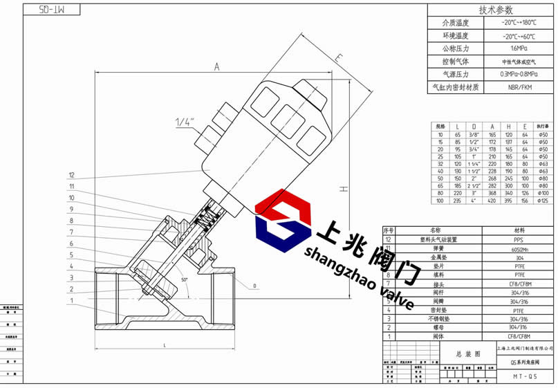 产品介绍 螺纹气动角座阀--产品概述: 内螺纹气动角座阀是由气动执行器与角座阀组合而成,双作用气动角座阀:当气源进入执行器的一端时,阀杆带动活塞运动角座阀处于打开状态;当气源从执行器另一端进入时,阀杆带动活塞运动角座阀处于关闭状态。单作用气动角座阀:角座阀常开,当气源进入执行器时,拉伸弹簧带动阀杆向下运动,阀门关闭;角座阀常闭:当气源进入执行器时,压缩弹簧带动阀杆向上运动,阀门打开。气动角座阀可代替进口产品,品质优、货期短,用户们无需再等待漫长的货期了。 螺纹气动角座阀--工作原理: 在非工作状态时,由于弹簧力作用,阀门常闭(开)。当执行器活塞被压缩气体作用时,阀门打开(关闭)。双作用形式靠压缩气体控制阀门开关。 螺纹气动角座阀--应用范围: 啤酒饮料灌装设备 制药及医疗设备 印染纺织 化工行业 气体工业 高温灭菌 发泡机械 水/污水处理 螺纹气动角座阀--特点: 流量大,流阻小,无水锤 Y型设计,增加30%流量 超长使用寿命 阀杆自动校正,自润滑,免维护 气缸采用不锈钢材质,在恶劣环境中更加优秀,可360°旋转。 螺纹气动角座阀--技术参数: 管道压力:Max1.6Mpa(232psi) 控制压力:0.3-0.8Mpa(43.5-116psi) 控制介质:中性气体或空气 阀体材料:CF8M/CF8(SS316,SS304) 密封材料:聚四氟乙烯 气缸材料:塑料PPS 气缸尺寸:27mm,32mm,40mm,50mm,63mm, 80mm,100mm,125mm 适用介质:水,酒精,油,染料,蒸汽,中性气体或液体,有机溶剂,酸碱溶液 介质温度:-10℃-+180℃,25℃-+220℃ 环境温度:-10℃-+80℃ 控制形式:单作用常闭,???,双作用常闭,双作用自由态 连接形式:螺纹式,焊接式,法兰式,快装式 螺纹气动角座阀图纸: ![]() | ||