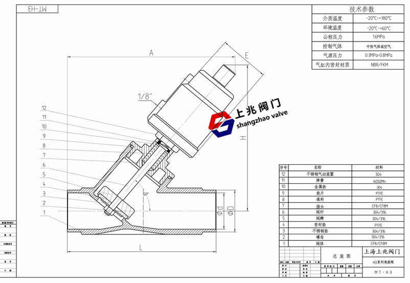 产品介绍 焊接气动角座阀--产品介绍 : 气动角座阀以316不锈钢为主要制造材质,广泛用于啤酒,纺织印染和漂白,制药及医疗设备,食品加工,橡胶机械,有机和无机化工,清洗消毒高温灭菌,水处理等行业,适用于介质为水,液体,中性气体,水蒸汽,轻微腐蚀性气体及液体,与电磁阀及其他阀门相比,具有投资经济,使用安全,免维护,寿命长的特点。 焊接气动角座阀--选项参数: 气缸材质:不锈钢/聚酰胺 阀座密封:PTFE(温度-20℃~+180℃)/F46(-20℃~+220℃) 选配附件:电磁阀/限位开关反馈信号/电气定位器/空气过滤减压阀 控制形式 直动式 阀体 不锈钢CF8M 结构 角座阀 阀芯材料 不锈钢 接口 G1/2-G2 阀座密封 PTEF 粘度 600mm2/s 活塞密封 FKM/NBR 介质温度 PTFE:-10℃~+180℃ 安装 任何位置 环境温度 -10℃~+60℃ 控制介质 空气 中性 气体 蒸汽焊接式气动角座阀零件表 名称 材料 名称 材料 阀体 CF8M 锁紧螺母 Hpb59-1 六角螺母 1Cr18Ni9Ti 指示杆 Hpb59-1 阀芯密封垫 PTFE 常闭弹簧 65Mn-D 阀芯体 OCr178Ni12Mo2 缸体 CF8M 阀体密封垫 FKM 顶盖 PC 连接 CF8M Y型圈 FKM 阀杆 OCr178Ni12Mo2 O型圈 NBR 阀杆密封套 PTFE 阀盖 CF8M 阀杆密封圈 PTFE 含油轴承 压紧密封垫 PTFE 垫圈 Hpb59-1 弹簧挡圈 活塞环 FKM 密封弹簧 65Mn-D 活塞 Hpb59-1 参数 接口 英寸 内孔 mm KV值 m3/h 最大工作 压力(bar) 要求最小 气源压力(bar) 执行机构 尺寸mm 流向 G3/8 13 3.7 0-16 4.0 40 阀座上方 G1/2 13 4.2 0-16 2.7 50 阀座上方 G3/4 20 8.0 0-16 2.7 50 阀座上方 G1 25 19.0 0-16 2.0 63 阀座上方 G11/4 32 27.5 0-16 2.0 63 阀座上方 G11/2 40 42.0 0-16 2.0 63 阀座上方 G2 50 52.0 0-16 2.0 63 阀座上方 G21/2 65 77.0 0-14 1.6 80 阀座上方1.气动角座阀按汽缸可分为: 单作用和双作用 单作用(气动头通常为一个孔);工作原理;根据弹簧复位达到开启和关闭的作用,分为??陀氤1招?。 双作用(气动头通常为两个孔);工作原理:给气控制其开关。 压力范围:0-1.6Mpa 介质温度:-10 ℃ ~+180 ℃ 环境温度:-10 ℃ ~+60 ℃ 阀体材料:不锈钢 密封材料:聚四氟乙烯 执行机构外壳:聚酰按、不锈钢 气动角座阀在生活中的应用: 控制气体:中性气体,空气 控制液体:自动化工业控制流体、食品级乳工业、生活用水、普通管道流体介质等。 2.焊接气动角座阀--应用范围: ①,啤酒饮料等灌装设备/beer & drinks filling machinery; ②,印刷纺织/textile printing&dying; ③,气体工业/gas industry; ④,制药及医疗设备/pharmacy & medical equipment; ⑤,化工行业/chemical industry; ⑥,高温灭菌/disinfection; ⑦,发泡机械/frothing equipment; ⑧,水污染处理/water sewage disposal。 3.角阀工作原理: 在非工作状态下,由于弹簧的作用,阀门常开或常闭。当执行器活塞被压缩气体作用时,阀门打开或关闭,双作用形式靠压缩气体来控制阀门开关 ⒉安装环境: ①,控制形式:直动式; ②,管道压力:MAX 1.6MPA(232psi); ③,控制压力:0.3-0.8MPA(43.5-116psi); ④,结构:角式 ⑤,接口:DN10-DN100; ⑥,介质粘度:600MM2/S; ⑦,介质温度:-10度-+180度(PTFE); ⑧,环境温度:-10度-+60度; ⑨,安装位置:任意位置(360度任选位置安装)。 4.安装与拆卸: ①,连接阀门至管道,确保阀体所附箭头与流体方向一致(阀体外侧箭头代表流体流动方向,安装请遵循); ②,焊接式安装:焊接时请拆离执行器; ③,螺纹、法兰、快装式安装:可正常安装; ④,拆卸:拆卸前确保对阀门的气压已解除;轻卸;拆卸后?;ず寐菸坪兔芊獠牧希?/div>