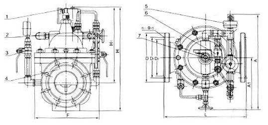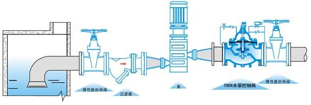 700X多功能水泵控制阀由主阀、电磁导阀、针阀、球阀、单向阀、行程开关、微形过滤器和压力表组成水力控制接管系统。水泵需停止工作时,先由进口压使主阀关闭90%后,水泵停止运转。剩余10%由回水关闭??煞乐顾赶窒蠓⑸?。本产品利用电磁导阀控制,不需要其它装置和能源。节约能源,保养简便,停泵平稳。电磁阀可采用交流电220V或直流电24V。 二、700X多功能水泵控制阀--工作原理