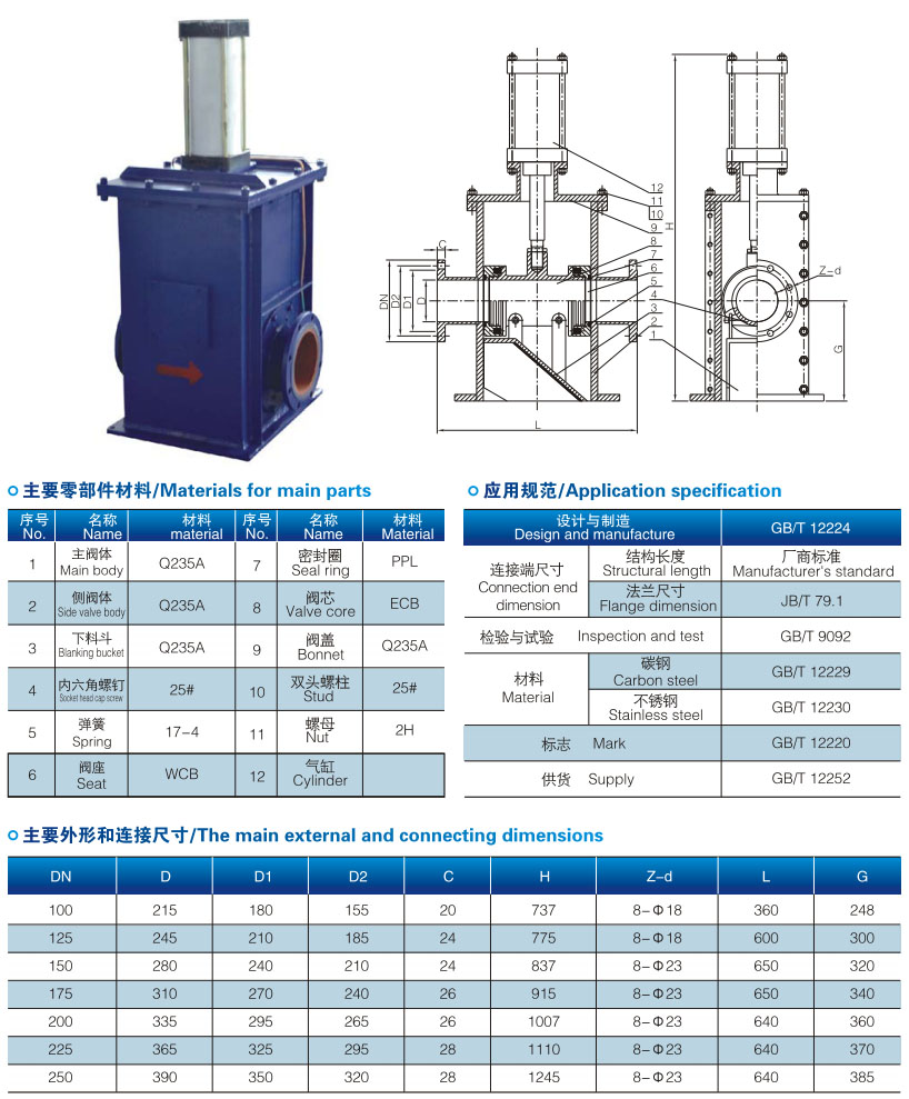 产品介绍 库顶切换阀--产品介绍: ZQ648TC-10C 库顶切换阀的开关是由通过电磁阀来的信号压缩空气控制的。根据在流程中起的作用不同,有空气、污氮切换阀,纯氮抑制阀、污氮三通阀等。从结构型式分,有立式和卧式两种。立式切换阀又可以分为气开式和气闭式两种。气开式是指信号压缩空气断气时,阀瓣依靠自重能自动打开;反之为气闭式。气开、气闭的选择由装置的安全性确定。氮气切换阀用气开式,空气切换阀用气闭式。 库顶切换阀--结构特点: ZQ648TC-10C 库顶切换阀用于电力工业气力输灰系统管道上,做为灰库之间切换装置。当气缸带动芯下行时,与两端通道接通,此时干灰通过管输送到另一座灰库,当气缸.上行时,干灰由下料斗引向下方,直接落入灰库。 安装前应将阀门清洗干净,并消除在运输过程中可能造成的缺陷。仔细核对阀门上的标识及铭牌是否符合使用要求。本阀门只能安装在水平管道上。若长期存放,应存在于干燥通风的室内,定期检查,防止生锈。运输过程中防止磕碰。 库顶切换阀--技术参数: 1、 公称通径: DN50~900mm(2”~36”) 2、 公称压力: PN1.0~4.0MPa(150~300Lb) 3、 适用温度: ≤200℃ 4、 适用介质:灰渣、泥渣、煤渣、矿浆、污水等 5、 应用范围:电力、石化、冶金、建材等工艺控制系统 6、 材质: 碳钢 不锈钢等 ![]() | ||